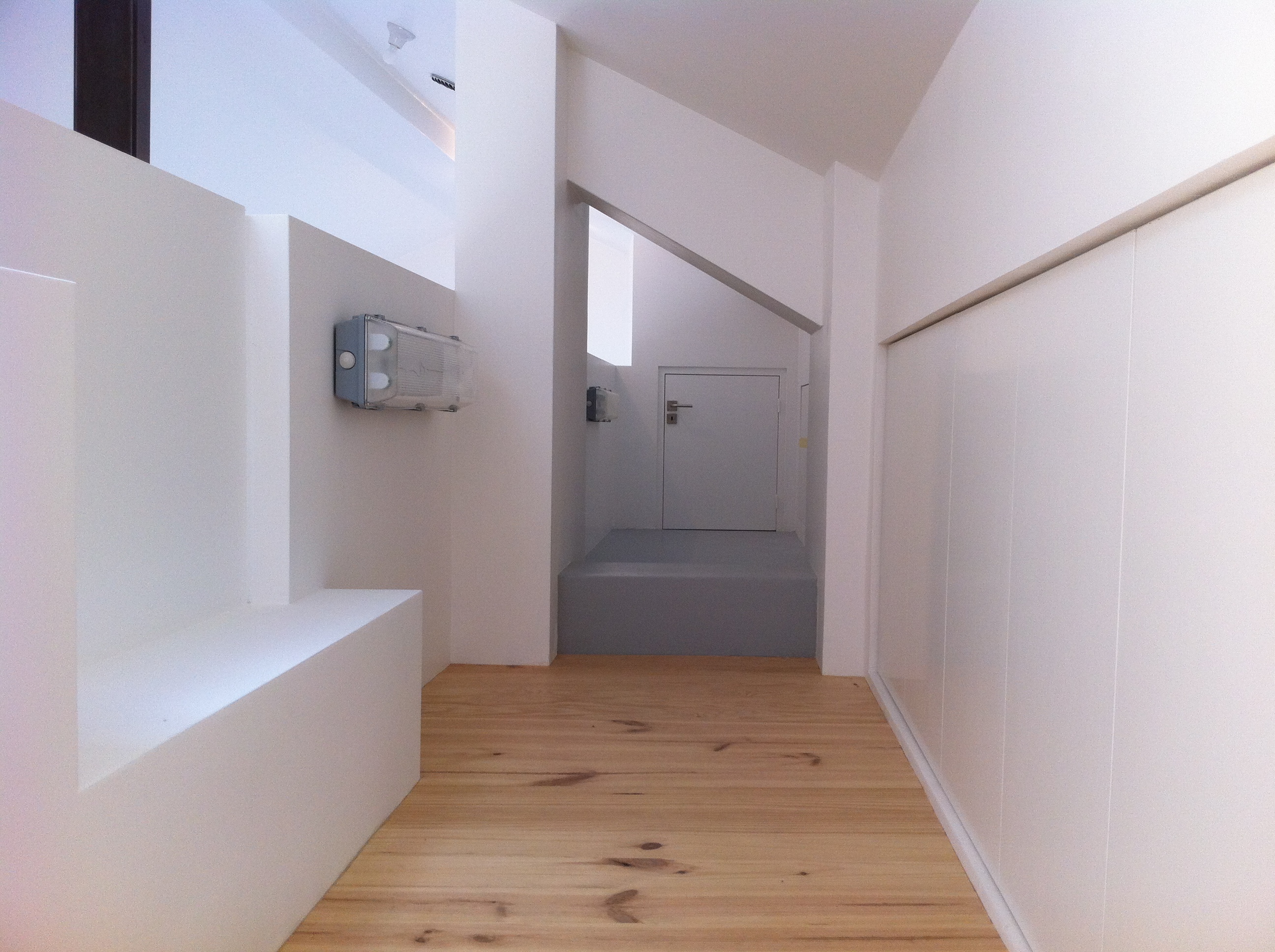 Response: A new glazed street façade provided a ground floor entrance to the house; a first floor internal ‘garden’ replaced the external stair, and a large opening was created through to the ground floor which was in turn opened into a single volume, whilst preserving the garage entrance for bicycles. A steel stair was designed and installed leading to an open double height library and gallery space serving the office, bedrooms and bathroom. A second stair leads to a mezzanine level in the acquired attic, providing a piano, tv, and guest space, with access to extensive storage. The volume is open and fluid between each of the levels, made living, as much by the design, as by the living occupation of the clients and their ultra-usage of every corner.